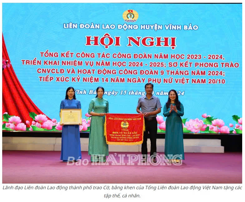 (HPĐT)- Chiều 15-10, Liên đoàn Lao động huyện Vĩnh Bảo tổ chức hội nghị tổng kết công tác công đoàn năm học 2023-2024, triển khai nhiệm vụ, ký giao ước thi đua năm học 2024-2025; biểu dương các tập thể, cá nhân có thành tích xuất sắc trong phong trào thi đua Lao động giỏi và xây dựng tổ chức công đoàn vững mạnh năm học 2023-2024; sơ kết phong trào công nhân, viên chức, lao động (CNVCLĐ) và hoạt động công đoàn 9 tháng năm 2024; tiếp xúc kỷ niệm 14 năm Ngày Phụ nữ Việt Nam 20-10; Biểu dương giáo viên, gia đình CNVCLĐ tiêu biểu; con CNVCLĐ có thành tích xuất sắc trong học tập, vượt khó học giỏi năm học 2023-2024.