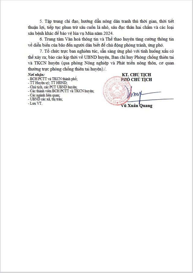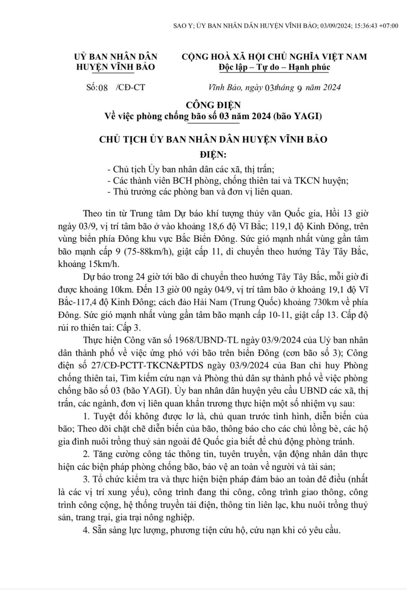 Công điện của chủ tịch ủy ban nhân dân huyện vĩnh bảo về việc phòng chống bão số 3 năm 2024 (bão yagi).