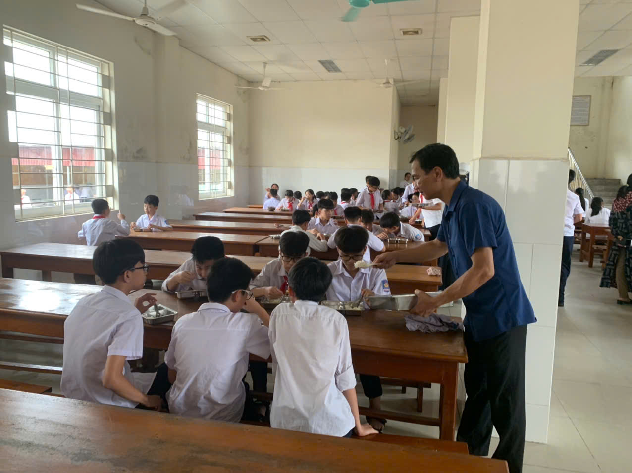 Đặc biệt, buổi ăn trưa hôm nay còn có sự quan tâm nhiệt tình từ các thầy cô chủ nhiệm và Ban Giám hiệu. Hình ảnh thầy hiệu trưởng tận tình quản lý và lấy cơm cho các em học sinh đã thể hiện sự chăm sóc chu đáo và gần gũi của nhà trường đối với học sinh. Các thầy cô không chỉ là những người dạy học mà còn là những người đồng hành, chăm lo cho sự phát triển toàn diện của các em.